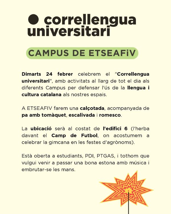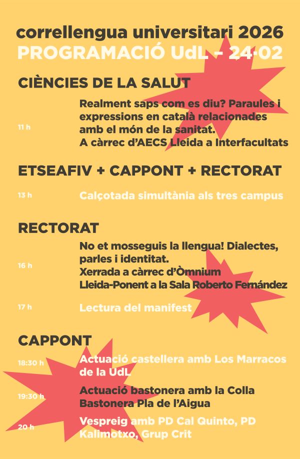 Descarregar PdfEl proper dimarts 24 de febrer, el campus de l’ETSEAFiV serà escenari d’una de les activitats del Correllengua Universitari 2026, una jornada reivindicativa que se celebrarà als diferents campus de la Universitat de Lleida amb l’objectiu de promoure l’ús de la llengua i la cultura catalana en l’àmbit universitari.