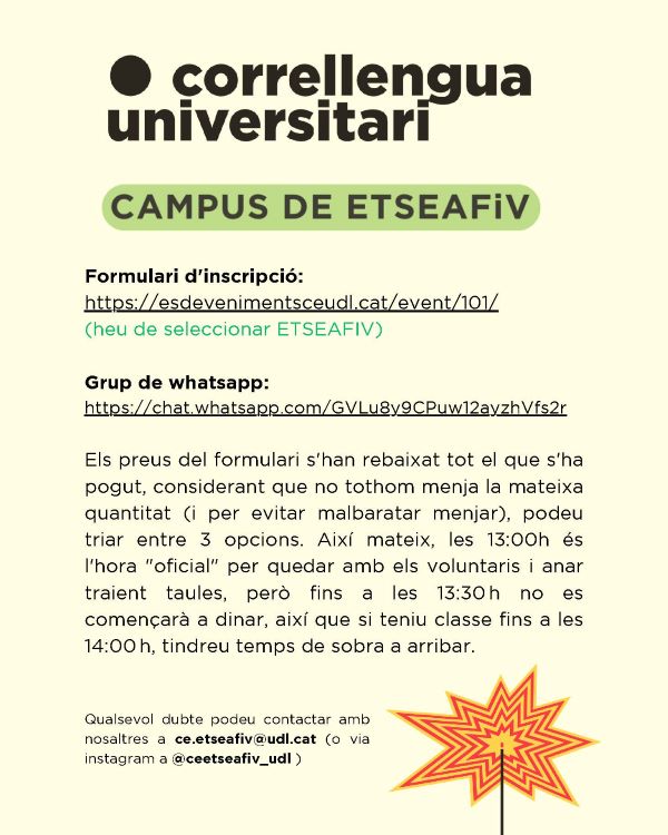 - Formulari d'inscripció: https://esdevenimentsceudl.cat/event/101/ (heu de seleccionar ETSEAFIV)